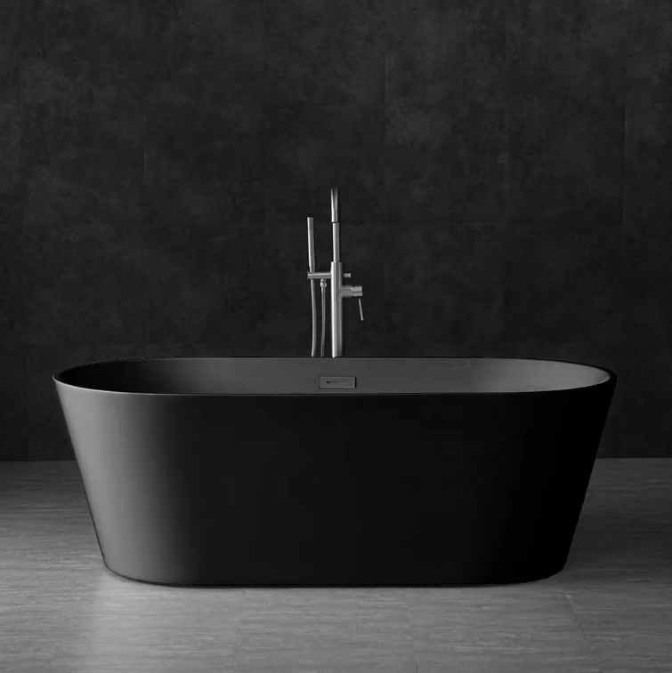1. Bold Modern Freestanding Design:This pure black freestanding acrylic bathtub adds a bold, modern touch to any bathroom. Its sleek silhouette makes it a standout centerpiece for contemporary spaces.